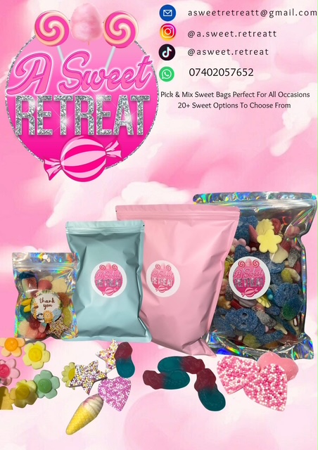 PARTY BAGS AND PIC AND MIX A SWEET RETREAT Supplying a large variety of sweets and chocolates, available in a range of sizes including 100g Party Bag Size, 500g, 1kg and 1.5 kg. Website: asweetretreat.co.uk Email: asweetretreatt@gmail.com